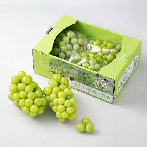 샤인머스켓은 껍질 채 먹을수 있는 청포도로 과육은 단단하고 아삭아삭한 식감이 특징입니다.